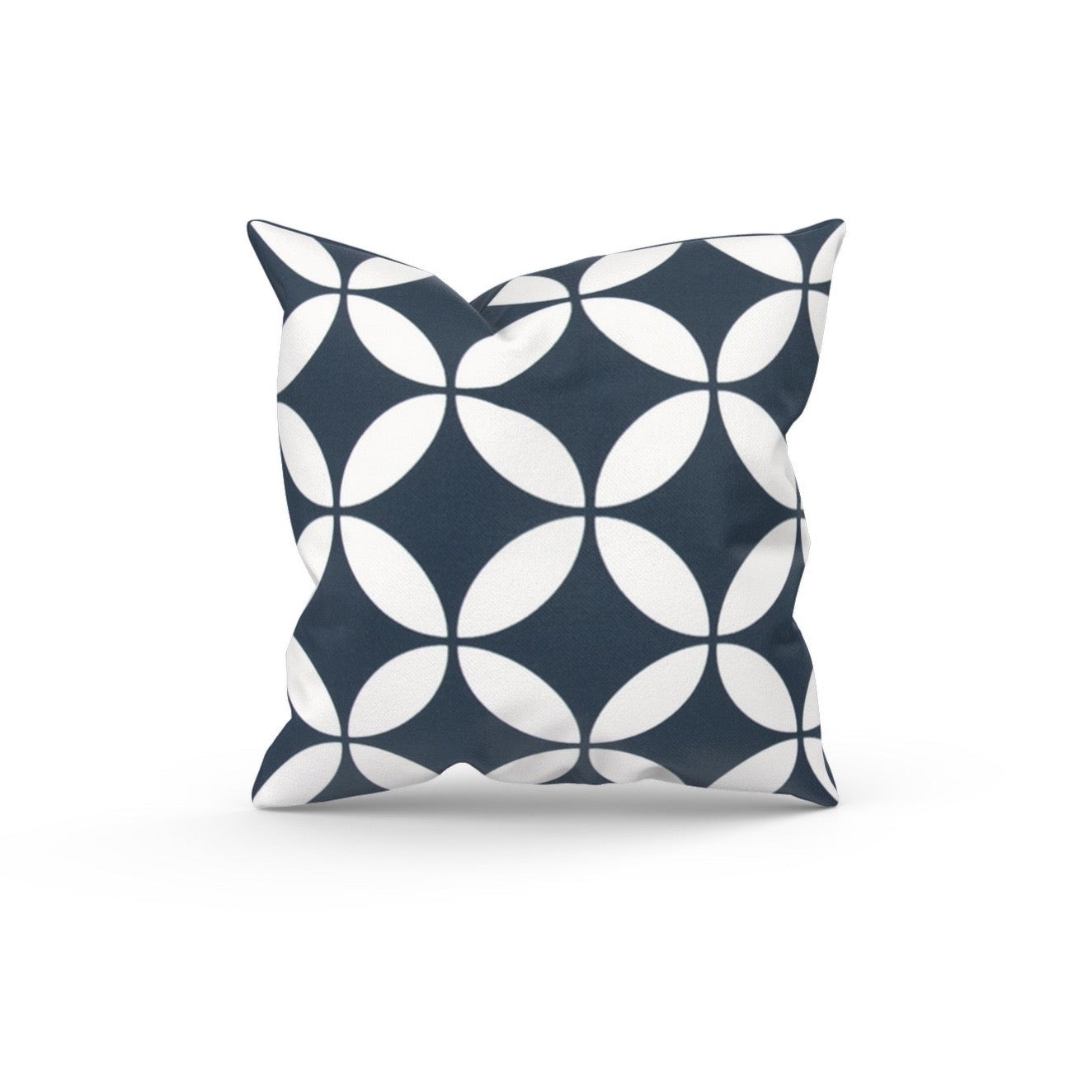 Our Blue and White Geometric Outdoor Pillow Cover is perfect for your patio, deck or porch! The zipper enclosure provides a smooth fit over your insert (not included). This cover is made with UV and weather resistant outdoor polyester and thread and it has a dark blue geometric pattern over a white background. We welcome custom sizes and cushion cover requests!