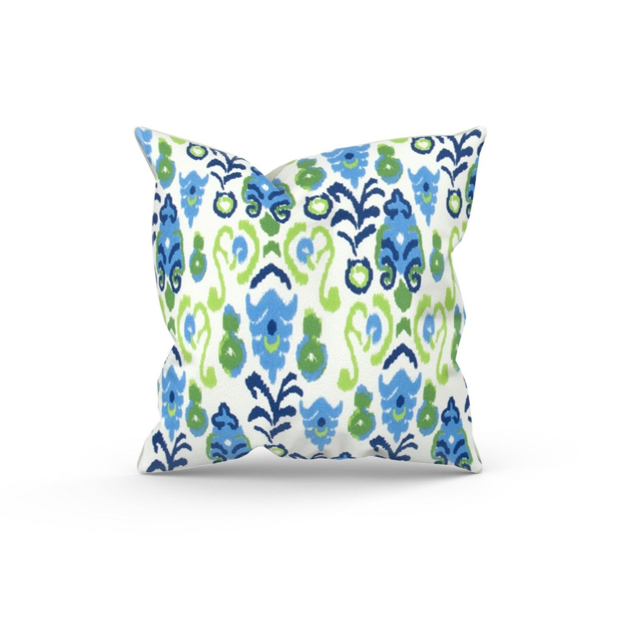 Our Blue Green Ikat Outdoor Pillow Cover is the perfect choice for any outdoor living space whether it's on your patio or deck seating! Made with fade resistant outdoor polyester, UV resistant thread, and a zipper enclosure which provides a smooth fit over your insert (not included). This cover is made with 100% outdoor polyester with a blue and green Ikat inspired pattern . We welcome custom sizes and cushion cover requests!