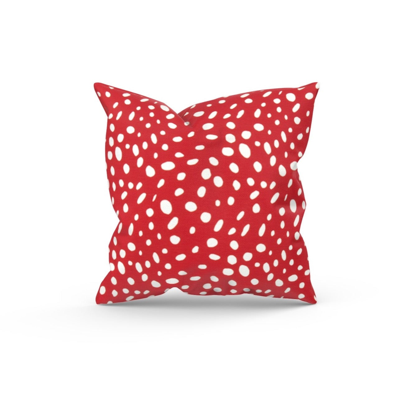 Our Bright Red Abstract Dots Outdoor Pillow Cover is read to shine on your couch in your Outdoor Living Areas! Whether you use it with your patio seating or deck decor, this pillow is always going to brighten up your surroundings. Covers are also thoughtful housewarming gifts for your new neighbor to use on their front porch! And don't forget about that a birthday gift for your BFF! The zipper enclosure provides a smooth fit over your insert (not included). This cover is made with 100% outdoor polyester with white abstract dots over a bright red background. We welcome custom sizes and cushion cover requests!
