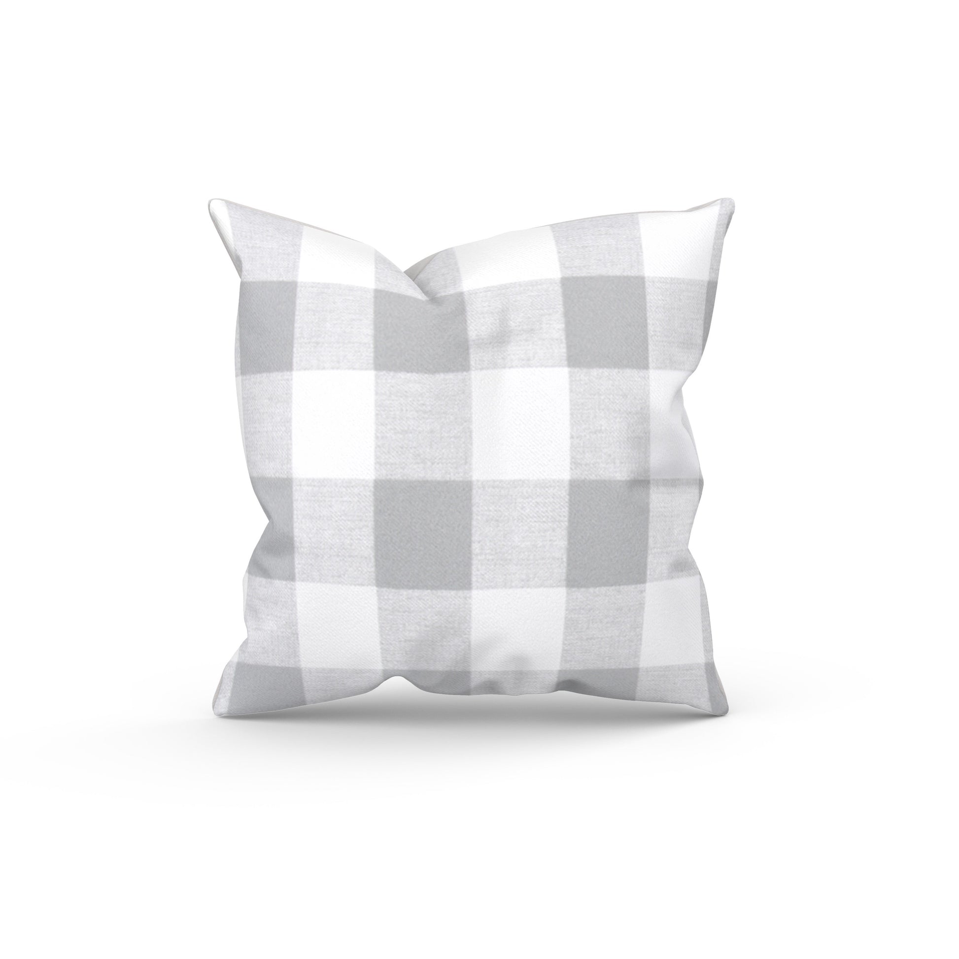 Our Grey Buffalo Check Outdoor Pillow Cover is the perfect choice for any outdoor living space whether it's on your patio or deck seating! Made with fade resistant outdoor polyester, UV resistant thread, and a zipper enclosure which provides a smooth fit over your insert (not included). This pattern has a grey buffalo check / plaid pattern on a white background.