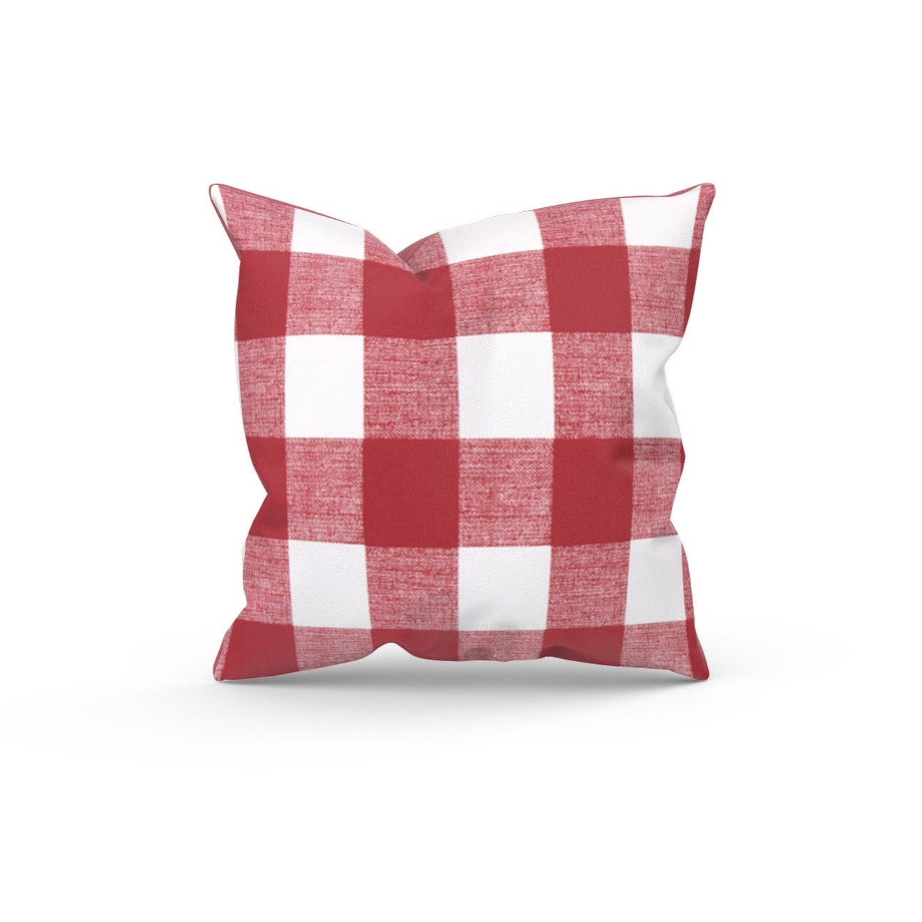 Our Red Buffalo Check Outdoor Pillow Cover is read to shine on your couch in your Outdoor Living Areas! Whether you use it with your patio seating or deck decor, this pillow is always going to brighten up your surroundings. Covers are also thoughtful housewarming gifts for your new neighbor to use on their front porch! And don't forget about that a birthday gift for your BFF! The zipper enclosure provides a smooth fit over your insert (not included). This cover is made with 100% outdoor polyester with a red and white buffalo check / plaid pattern. We welcome custom sizes and cushion cover requests!